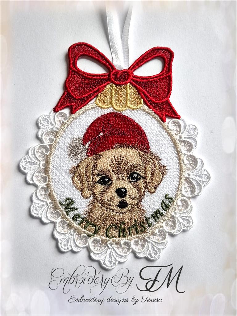 Christmas decoration with a puppy/5x7 hoop/in 4 languages/English, Czech, French, and German